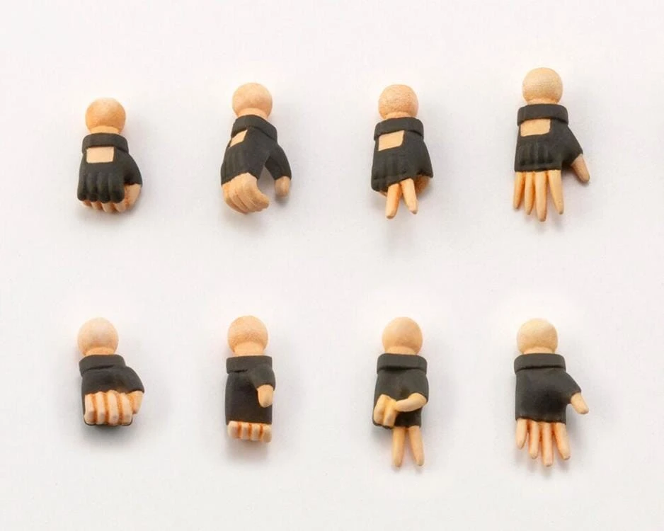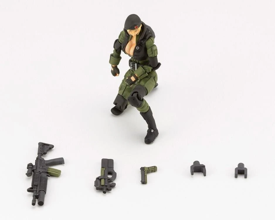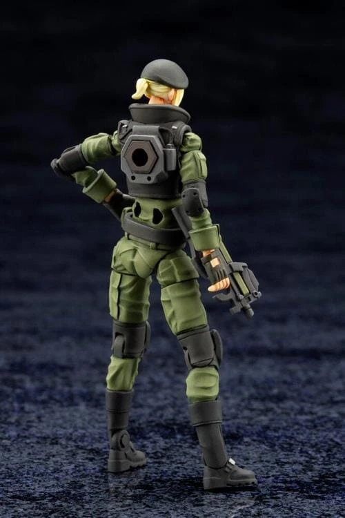 This model is 71mm in size with 22 points of articulation. The kit includes four different head parts; one wearing a beret, one with earmuffs, one with shooting glasses, and the last without. Create various scenes with the four sets of hand parts included; closed, holding, open, and one making a hand sign. The kit includes a handgun, assault rifle A (bullpup rifle), and assault rifle B (grenade launcher included).