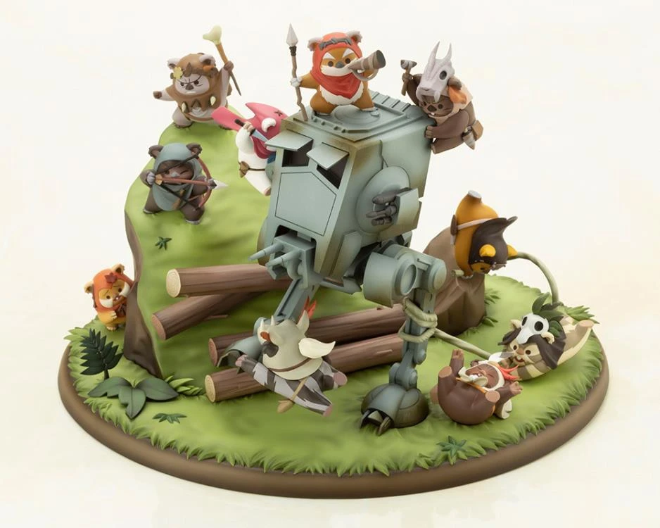 Brought to life in a fully-detailed diorama, the Ewok tribe of the forest moon of Endor create a cute and gallant scene in their battle against the Imperial army.
